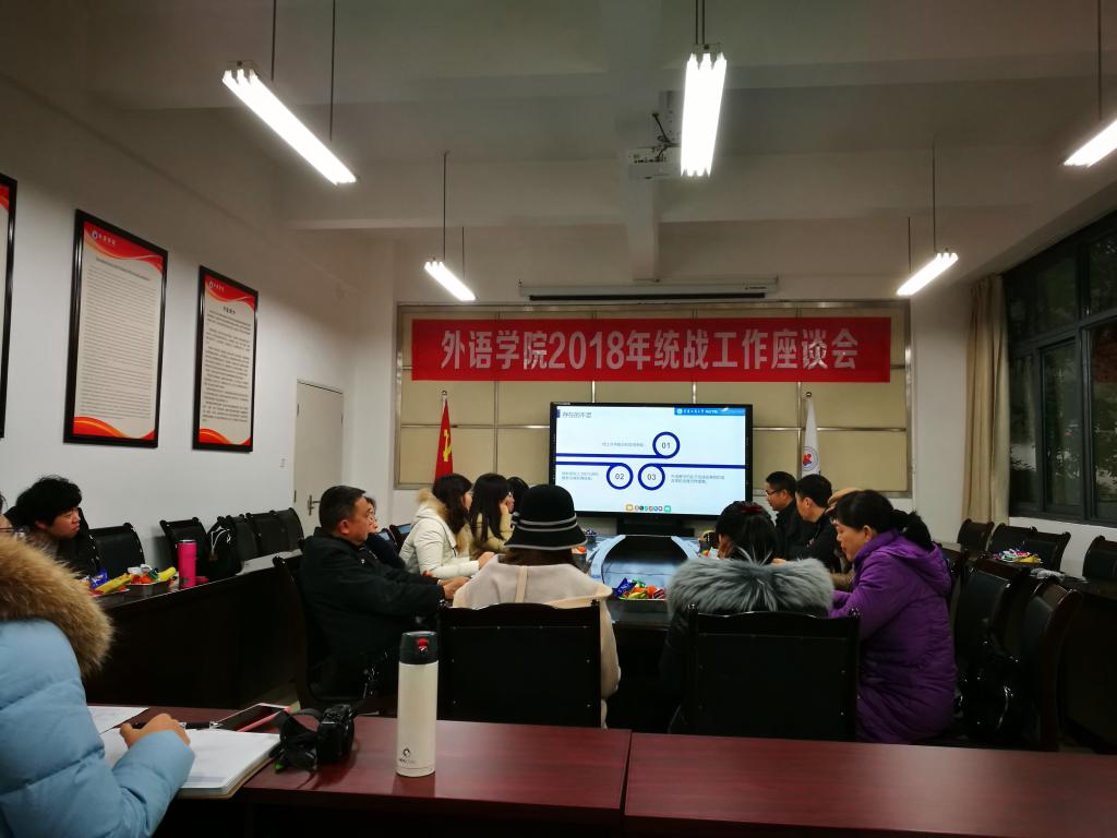 1月16日上午,外语学院召开了2018年统战工作座谈会。学院班子成员、工会主席、民主党派教师、留学归国人员代表和少数民族教师代表等20余人参加了座谈会。会议由党总支书记陈晓东主持。