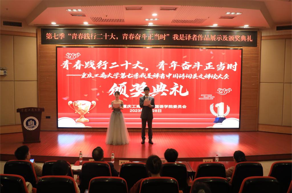 4月28日下午,第七季“我是译者”中国诗词英文译读大会作品展示暨颁奖典礼在7200报告厅举行。公司党委书记唐春秋,副书记吴欢欢,分团委书记周利民及评审老师季峥出席活动现场。颁奖仪式包含为获奖作品颁奖、优秀作品朗读、选手翻译经验分享和评委翻译技巧点评分享四个环节。无论是龙凤、李雪菲、兰星、陈江冰、马晓菲、赵倩娴六位同学翻译的二十大金句,还是马晓菲翻译的《书愤》,李思雨翻译的《望江南·超然台作》,都得到了评审老师的充分肯定。通过参与本次活动,同学们翻译的基本功得到了进一步锤炼,在外语翻译的过程中,同学们也重温了中国传统优秀文化和党的二十大精神,达到了以赛促学的目的。点评老师季峥讲到“虽然中国文化的外译和传播‘道艰且长’,但是‘行则将至’,只要我们译者坐得住板凳,耐得住寂寞,‘行而不辍’,终将‘未来可期’。”