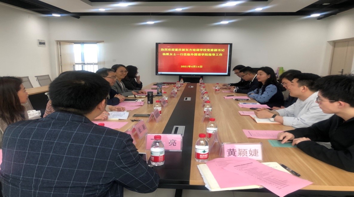 本次座谈会参会人员有重庆新东方培训公司党委常务副书记、人力资源部总监&教务管理部总监杨帆、国际教育事业部总经理董燚冰等一行6人,公司党委书记唐春秋、经理周琳、副书记吴欢欢、组织员黄生、学院各系部主任、辅导员等参与会议讨论。